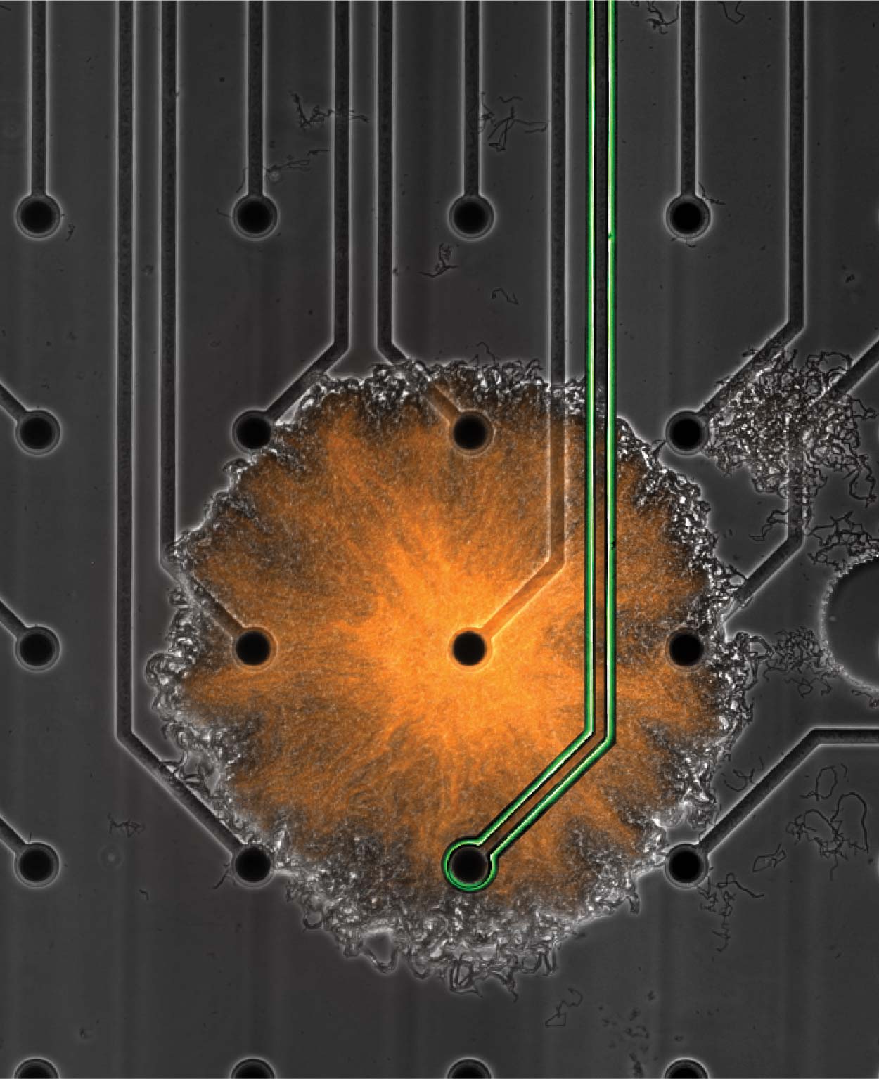 A community of bacteria known as a biofilm (orange) is shown growing on a microelectrode array (black circles). This newly developed device allows the selective stimulation of one type of bacterial cell around a microelectrode (green track).
