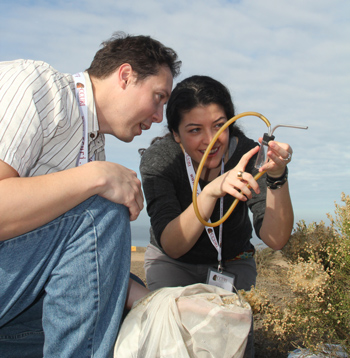 Nick Reeves of Mt. San Jacinto College in Riverside County and Erin Ryan of Edmonds College in Seattle collect insects in the Scripps Coastal Reserve.