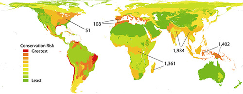 Fig 1: In the face of impending global change, some regions are more in need of protected lands than others. The map shows regions color-ranked by how much area is projected to change by 2100 in relation to how much area is currently protected ("Conservation Risk"). Many of the tropical, but not temperate regions with greatest risk (red) are also of highest conservation value as indicated by their higher number of globally unique amphibians, birds, mammals and reptiles. High change-protection ratio and much unique biodiversity combine to high conservation need (see Fig 2).