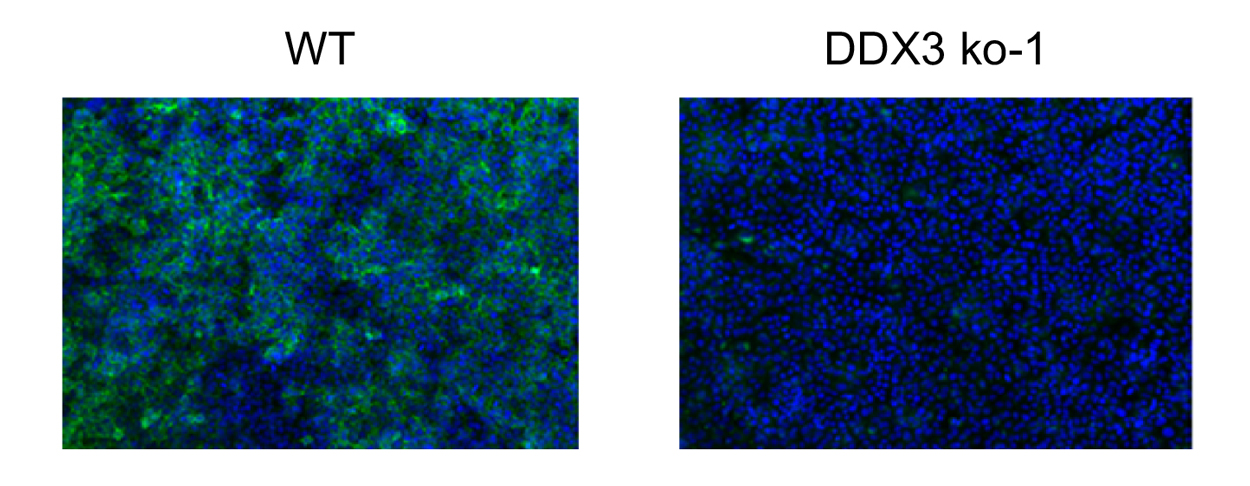 Images show wild type (WT) and DDX3-deficient (ko-1) cells infected with Lassa virus (green). Note the significant drop in Lassa virus multiplication in DDX3-deficient cells.