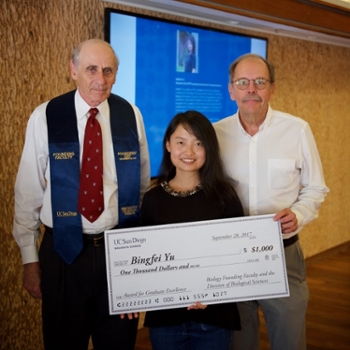Founded in 2014, the $1,000 award is bestowed annually through an endowment from the Division of Biological Sciences’ founding faculty. Yu was recognized during an award ceremony Sept. 28, 2017 at UC San Diego’s Faculty Club.