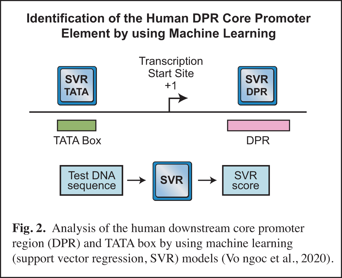 In humans, the analysis of the downstream core promoter region was particularly challenging. In Drosophila, the downstream MTE and DPE elements are commonly found and have been extensively characterized, but it was difficult to discern whether or not these elements exist in humans. This puzzle was ultimately solved by using machine learning (Vo ngoc et al., 2020) (Fig. 2). In this work, we generated a machine learning (support vector regression, SVR) model for the human downstream core promoter region (DPR), which encompasses the positions of the Drosophila MTE and DPE (Fig. 1). The SVR model was accurately able to predict the presence of an active DPR element in humans.